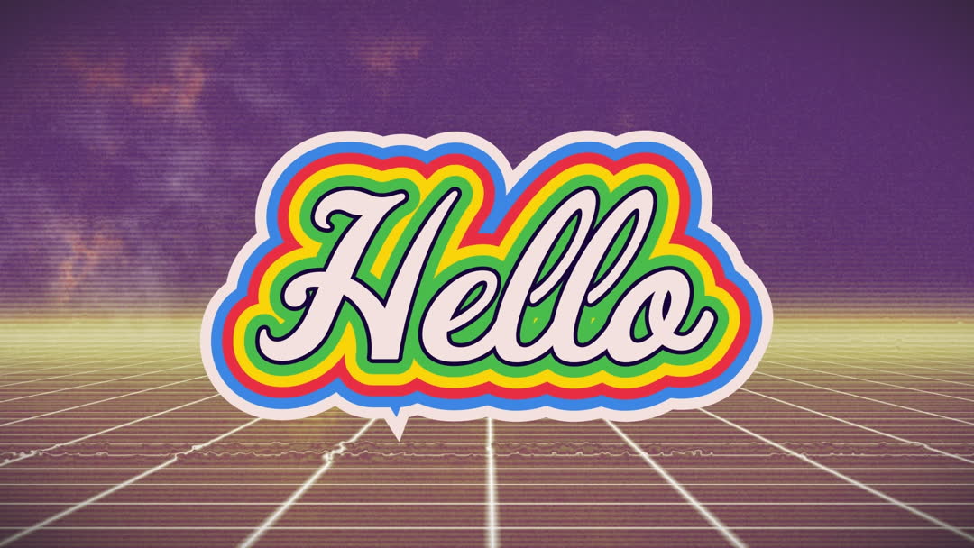 This vibrant graphic features a colorful 'hello' text set against a digital grid background with a violet hue. Perfect for designs emphasizing a retro or 80s-inspired theme, ideal for digital greeting cards, social media posts, or promotional content seeking an engaging and dynamic style.