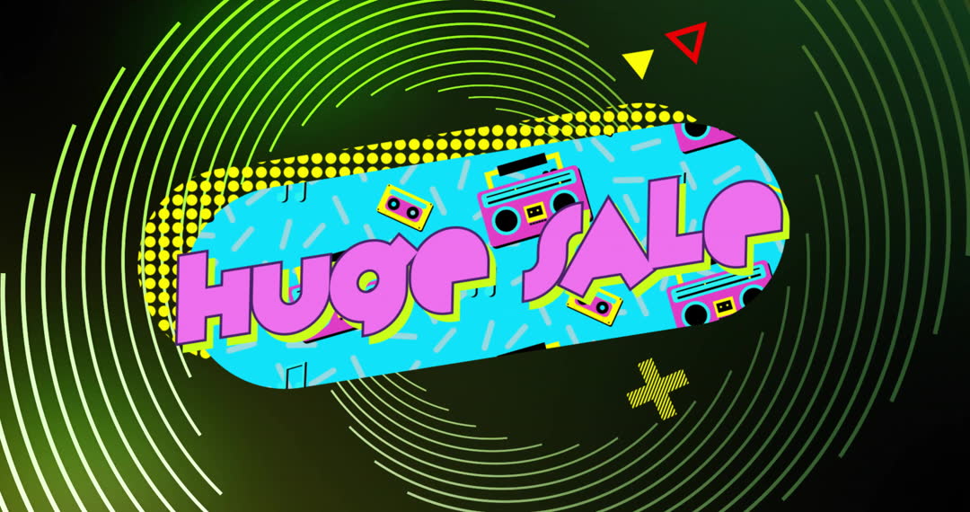 This vibrant animation features the text 'Huge Sale' with a retro, colorful background complete with playful spiral shapes and geometric patterns. Ideal for digital marketing campaigns, social media ads, and technology-themed promotions seeking to capture attention with a dynamic and nostalgic aesthetic.