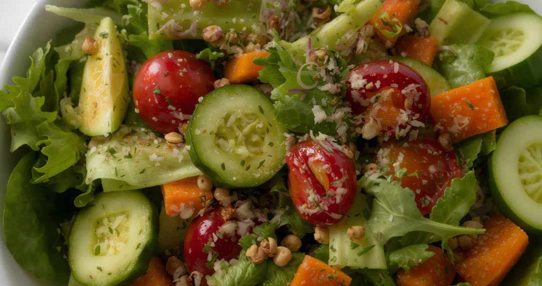 AI Generated Image. This video reveals a vibrant, healthy selection of fresh vegetables like cucumber, cherry tomatoes, and lettuce in a clean, white bowl from a top-down perspective. Ideal for use in content promoting healthy living, culinary refreshers, farm-to-table cuisine, or minimalist meal presentations, this lively presentation of ingredients creates an appealing blend of color and nutrition perfect for cookbooks, food blogs, and organic ingredient promotions.