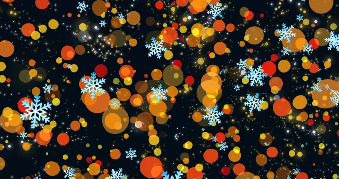 Energetic animation showing vibrant snowflakes and multicolored lights floating on a dark background, evokes feelings of winter and festive joy. Perfect for greeting card designs, holiday and festive background creation, or multimedia projects requiring a lively and spirited backdrop. Ideal for use during winter-themed events or celebrations seeking a dynamic visual effect.