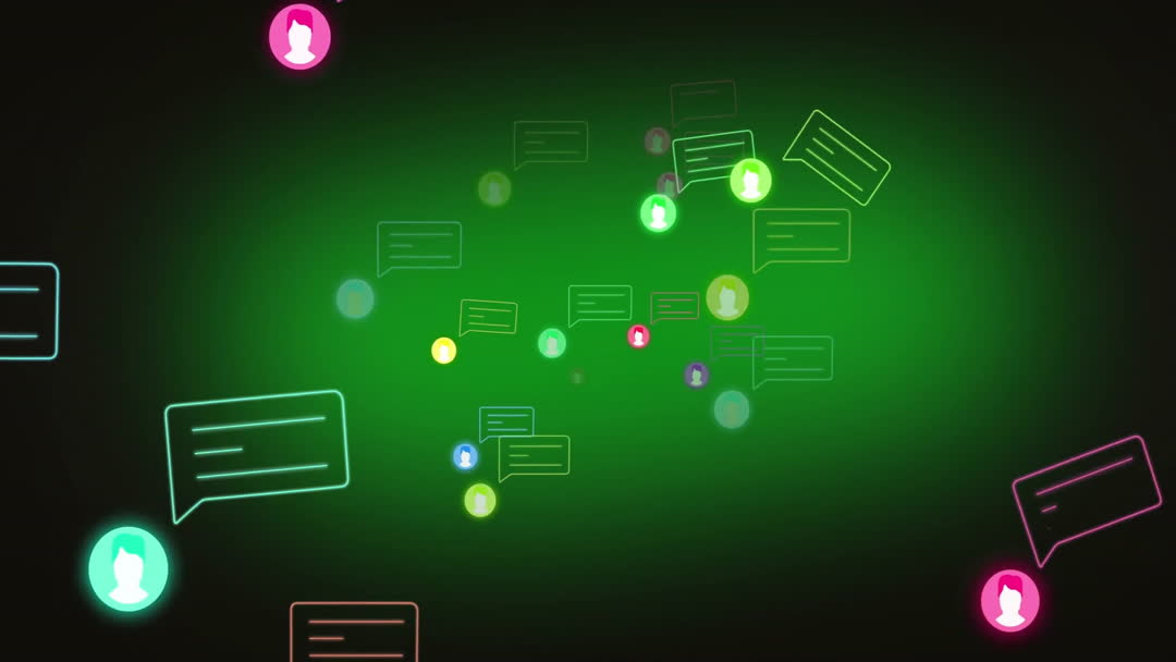 Vibrant social media notification and chat animation against a green background showcases digital communication in a dynamic, eye-catching style. The floating chat bubbles and icons reflect connectivity and online presence, useful for digital marketing presentations, internet communication topics, social media strategies, and tech-themed projects.