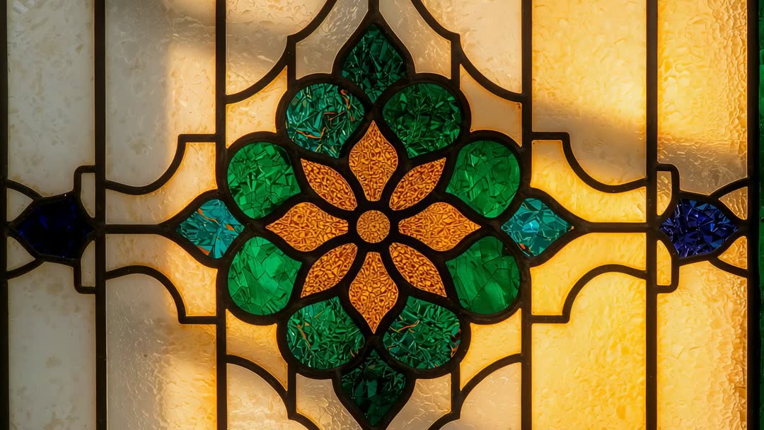 AI Generated Image. Vibrant stained glass panel coming alive with dynamic interplay of light, as shifting sunlight casts moving shadows throughout the day. The careful craftsmanship highlights an ornate floral design enhanced by bright greens, blues, and amber tones. Perfect for promoting traditional craftsmanship, decorative art, and interior design, or evoking ambiance and elegance in religious or historical contexts.