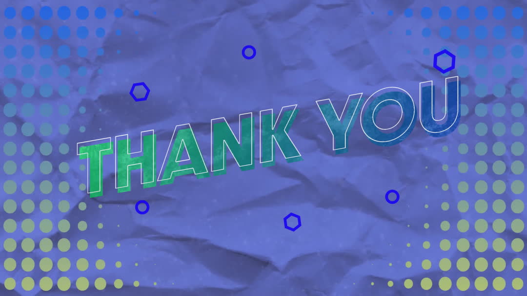 Digital animation showcasing 'Thank You' text with a backdrop of colorful geometric shapes. The vibrant and modern design makes it suitable for digital thank-you messages or social media posts. Ideal for adding a creative and engaging touch to online communications, presenting gratitude in a visually dynamic way.