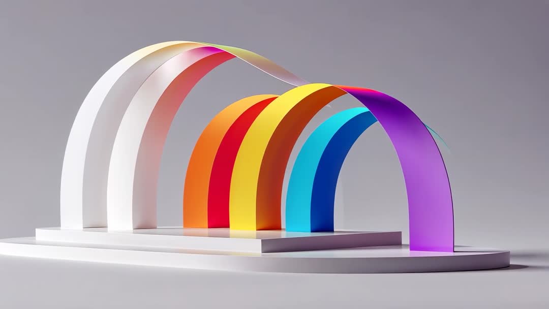 AI Generated Video. This visual features a translucent ribbon flowing dynamically over a series of arches arranged on tiered platforms. The vibrant colors of the arches stand out against the studio setting, creating a modern and abstract aesthetic. This piece is ideal for use in articles or content related to contemporary art and design or as a philosophical representation of progress and flow in promotional materials, where creativity and differentiation are emphasized.