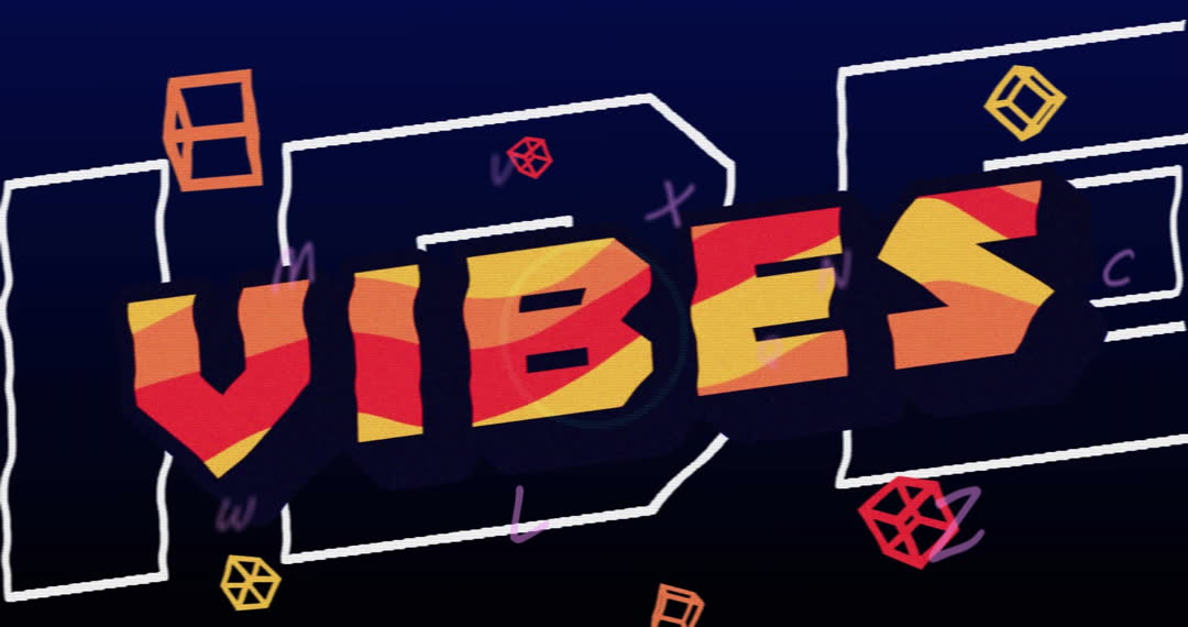 Bold animated typography displaying the word 'Vibes' in vibrant colors, surrounded by 3D geometric shapes against a dark backdrop. This abstract style evokes a sense of energy and modern design, suitable for use in educational materials, branding projects, or digital learning platforms focusing on creative and contemporary aesthetics.