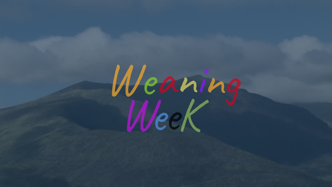 Vibrant and creative typography showcasing 'Weaning Week' against a scenic mountain and cloud backdrop. The playful use of different colors can attract interest for events and educational purposes focused on weaning practices. Useful for social media graphics, event promotions, or awareness campaigns.