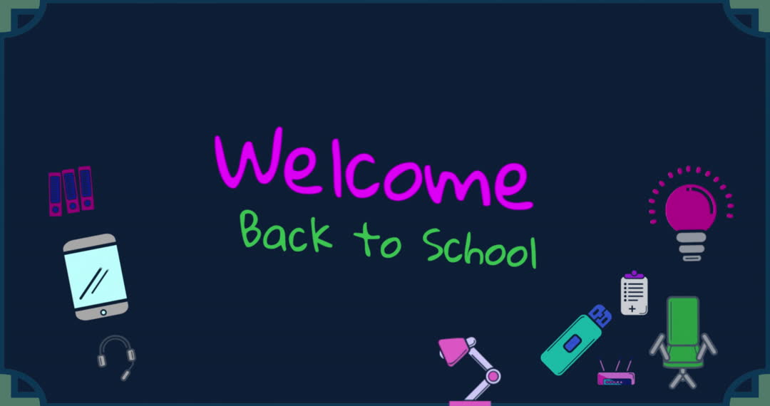 This colorful digital welcome message is perfect for an educational setting, signaling a cheerful return to school. Featuring neon text alongside modern educational and technological icons on a dark background, it can be used for newsletters, posters, digital announcements, and social media promotions aimed at students, parents, and school faculty.