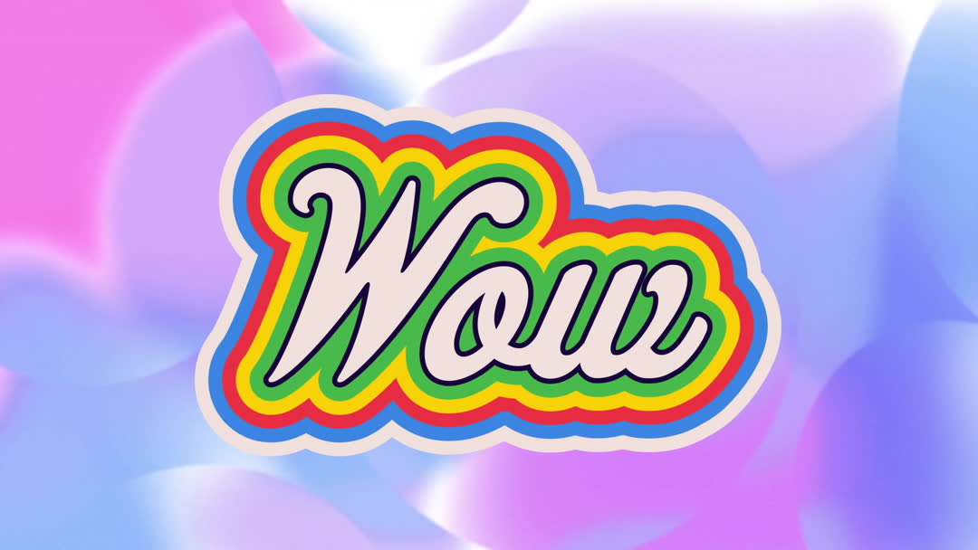 Colorful and bold 'wow' text stands out against a dreamy gradient of pinks and purples. With its multilayered rainbow effect, this design draws inspiration from retro pop art, making it ideal for social media graphics, eye-catching posters, or digital artwork focused on dynamic and engaging aesthetics.