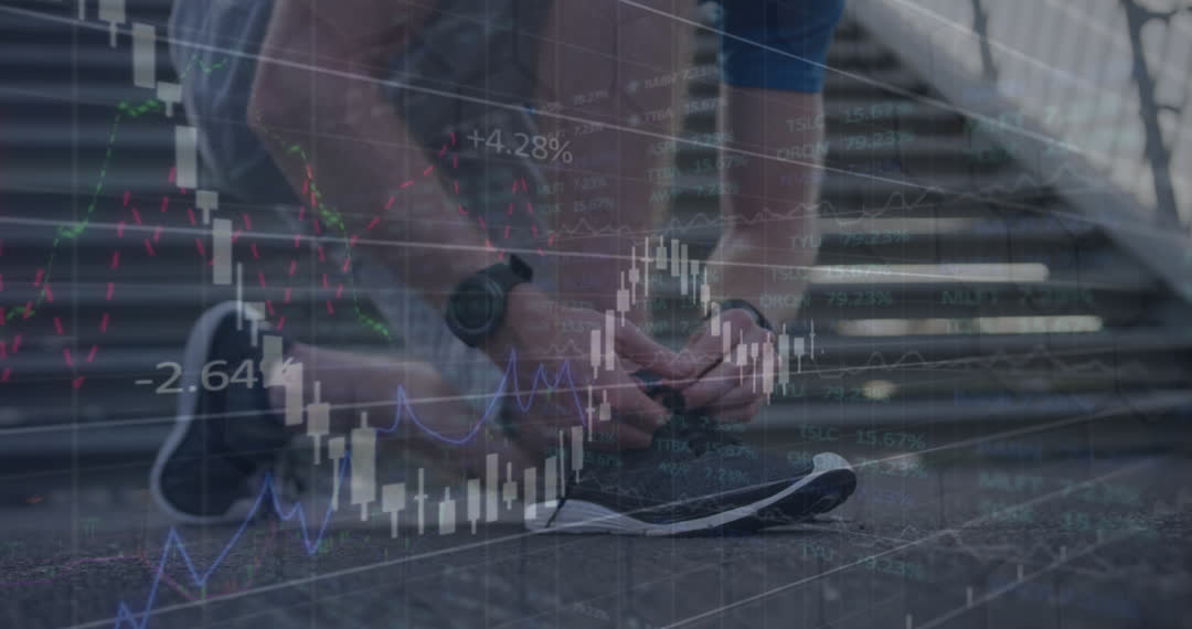 Midsection view of man tying his shoelace with overlaid digital graphs and stock market percentages creates a futuristic feel. This can represent a connection between personal health and economic trends, suitable for uses in business presentations, wellness blogs, or articles discussing how financial stability is linked to physical well-being.