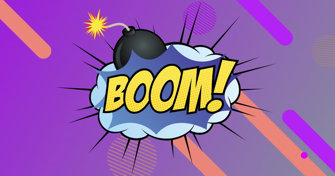 Bright and animated comic-style videory features bold 'Boom' text with vibrant colors and abstract shapes against a purple background. Suitable for teaching materials, multimedia projects, invitations, and expressions of excitement or impact.