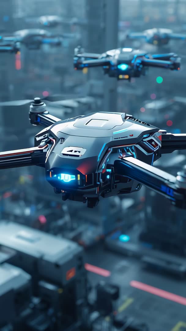 AI Generated Image. Video showing command drone leading formation while hovering through dense urban aerial corridor, featuring blue navigation lights and sleek quadcopter design. Camera focusing on lead unit with trailing fleet fading into cityscape, creating cinematic depth and motion. Scene conveying futuristic urban mobility, autonomous logistics, aerial surveillance, and high-tech transportation themes. Use cases: ideal for tech product launches, UAV manufacturer promos, smart city and mobility presentations, news and documentary segments about drone regulation or urban air mobility, social media vertical ads, and mobile app previews. Use as opening hero shot, background for infographics, or basis for motion graphics with HUD overlays and map routing. Technical notes: vertical video format optimized for mobile platforms and portrait social feeds. Lighting offering strong blue accents and cinematic bokeh, enabling color grading and visual effects integration.