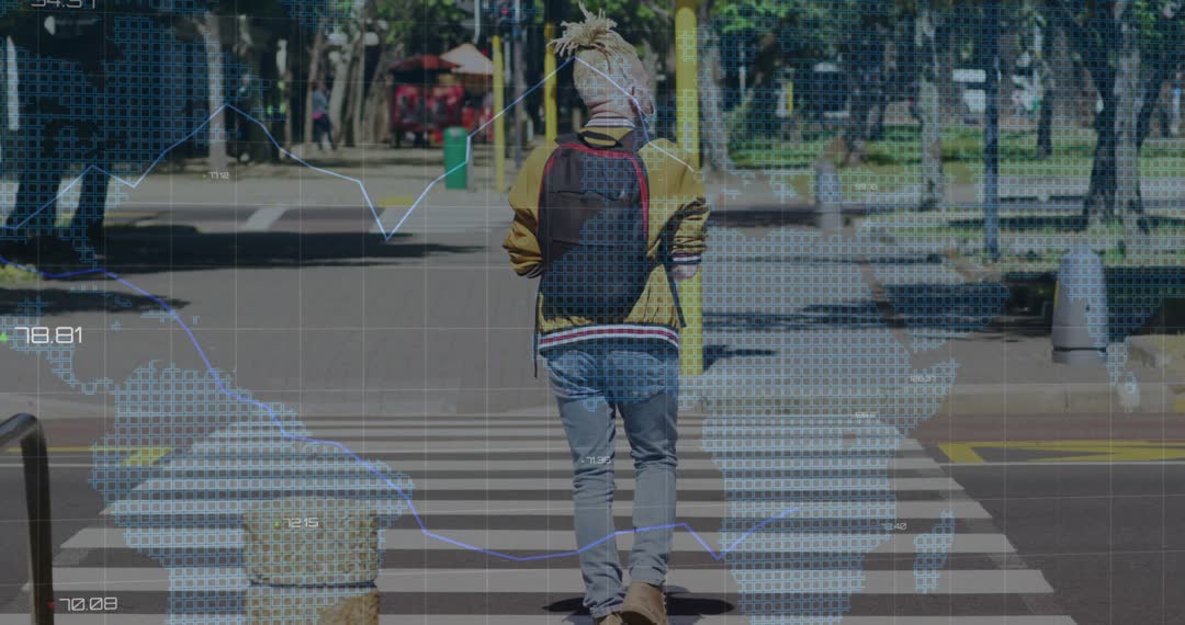 Showing male commuter walking across city crosswalk while digital HUD overlay displays mobility metrics and global map. Featuring backpack, casual jacket, daytime urban street with trees and benches in background. Overlaying grid lines, line charts and map markers conveying pedestrian flow analytics, traffic trends and movement patterns. Suiting usage in smart city campaigns, mobility research presentations, transit app promotions, data-driven urban planning reports, news segments and corporate technology videos. Providing cinematic b-roll for documentaries, explainer videos and digital adverts focusing on transport innovation. Delivering clean frame for adding lower third graphics, voiceover and animated infographics. Optimizing for widescreen layouts, social media clips and website hero backgrounds.