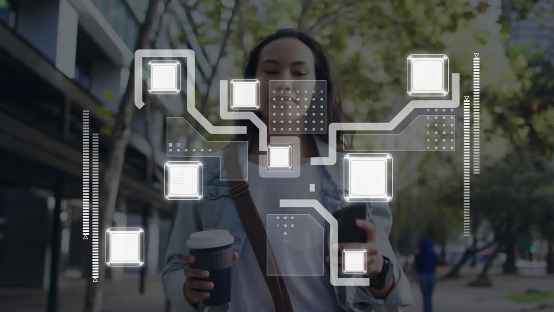 Video capturing commuter woman walking on sidewalk while holding coffee cup and interacting with smartphone and glancing at smartwatch. Futuristic augmented reality HUD overlay floating across frame, showing glowing nodes, data lines, and interactive panels linked to wearable device. Footage focusing on urban mobility, mobile connectivity, wearable tech interaction, and hands-free notification workflows. Content serving well for tech demos, app promotions, corporate presentations, online ads, social media stories, training modules, and editorial segments. Suggested edits: cropping for vertical mobile format, adding voiceover about device integration, overlaying branded UI animations, color grading for high-tech mood, looping for background motion. Ideal for illustrating concepts such as IoT, smart city, mobile UX, AR navigation, commuting lifestyle, and digital transformation.