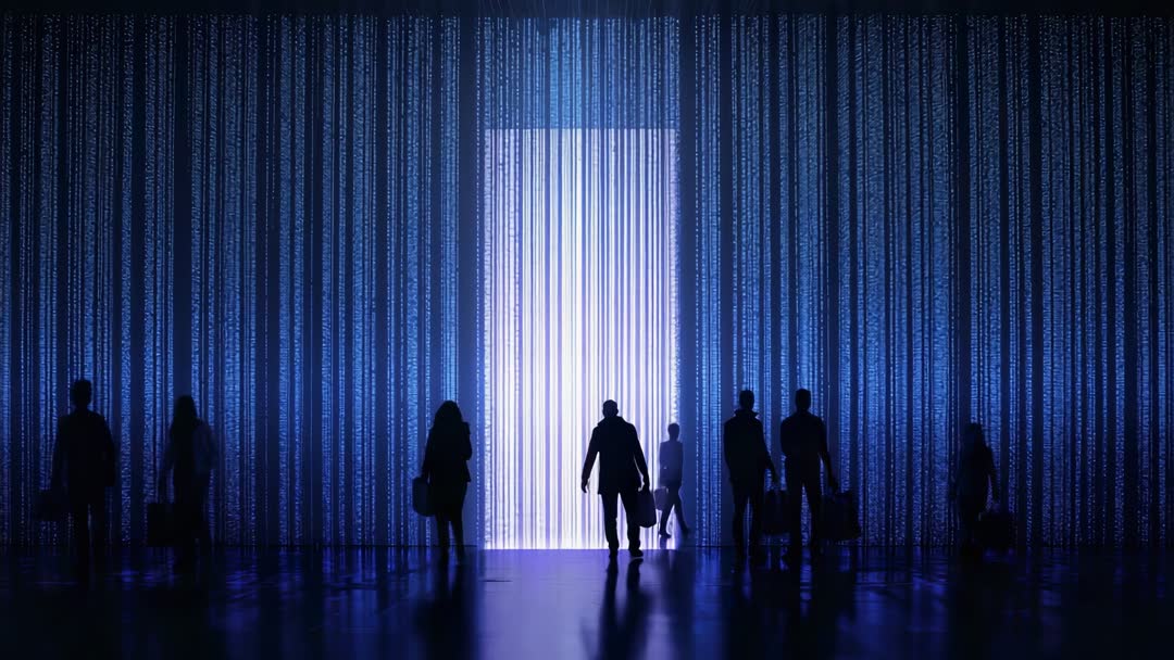 AI Generated Image. Featuring backlit silhouettes walking toward towering vertical curtain of pulsing blue light and streaming binary-like lines, creating cinematic sense of movement and anticipation. Footage combining human commuters with digital data motifs, suggesting themes of technological transition, urban mobility, corporate transformation, and cybersecurity. Serving well for opening sequences, background loops for events, website hero banners, keynote presentations, and marketing campaigns for tech companies or transit authorities. Allowing easy addition of overlays, lower third titles, or logo animation for promotional videos, digital ads, corporate communications, editorial features on future of work, and immersive installations.