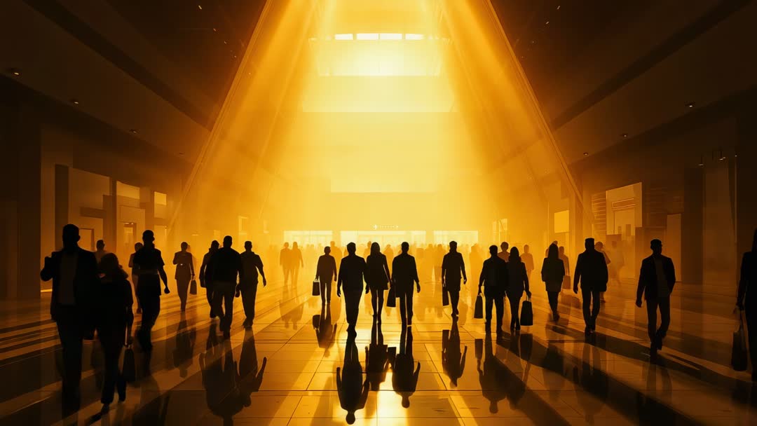 AI Generated Image. Video clip showing commuters walking from bright skylight through modern terminal, silhouettes casting long reflections on glossy floor. Warm golden light streaming through high atrium, creating dramatic backlit scene and deep contrast. Footage conveying rush hour energy, business travel flow, and architectural scale. Clip serving well as opening shot, establishing sequence, broadcast intro, corporate presentation opener, travel agency promo, airport branding element, website hero header, social media ad background, documentary b-roll, or cinematic montage. Footage working well with title overlays, lower thirds, slow-motion or time-ramp edits. Color grading emphasizing rich amber tones for moody cinematic feel. Composition offering negative space for text placement and logo reveal, and pacing allowing seamless looping or rhythmic edits.