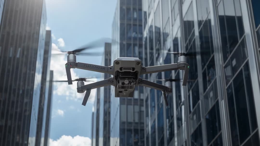 AI Generated Image. Video showing compact quadcopter hovering between glass skyscrapers, capturing stabilized gimbal footage with spinning rotors visible. Cinematic composition emphasizing scale of high-rise architecture and narrow urban canyon perspective. Serving corporate marketing, real estate promotions, architectural visualization, drone technology demos, and news coverage of city infrastructure. Clip working well as opener for tech presentation, background for website hero banner, insert B-roll for corporate video, or establishing shot for documentary and broadcast. Footage delivering crisp detail, dynamic motion, and professional look for editing into 4K projects, social media reels, or commercial ads.