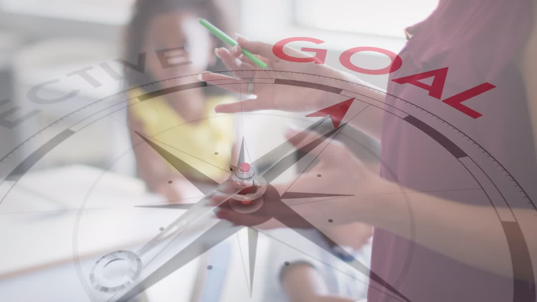 Visual concept features compass animation superimposed over group of schoolchildren and teacher, symbolizing guidance and direction in education. Useful for illustrating educational goals, setting objectives in learning environments, training resources, or promotional materials focusing on diversity and motivation in academic fields.