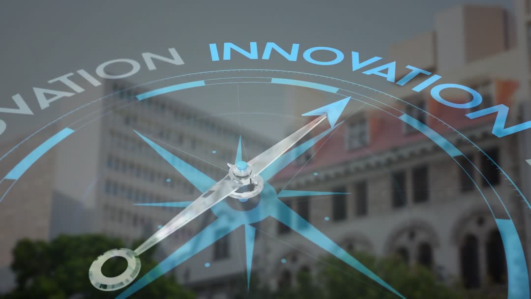 Compass Pointing Towards Innovation with Cityscape Background Video