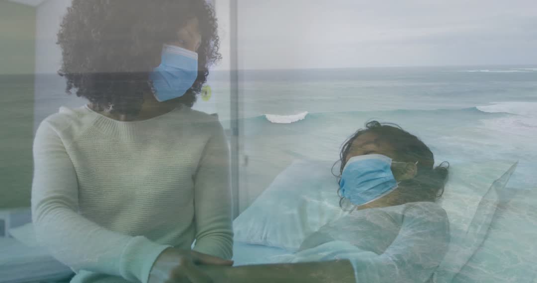 Woman wearing medical mask holds hand of bedridden patient in cozy hospital room. Background offers calming ocean view, conveying themes of compassion, support, and recovery. Useful for illustrating ideas about healthcare, caregiving, patient support, emotional healing, and peaceful recovery environments.