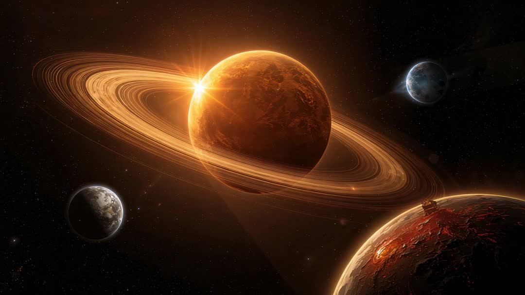 Complex Cosmic Phenomenon: Ringed Planet Illuminated by Peeking Star Video