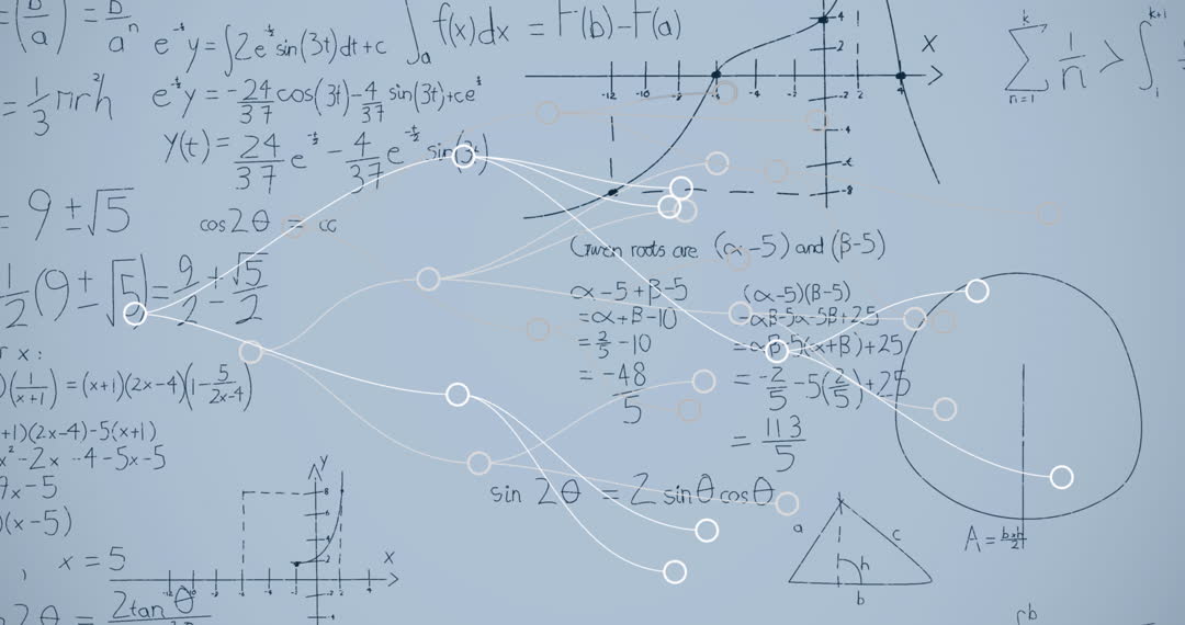 Features a series of mathematical formulas intertwined with network connections. Useful for illustrating educational content, scientific articles, technology presentations, and academic publications focused on mathematics, algebra, geometry, or digital systems.