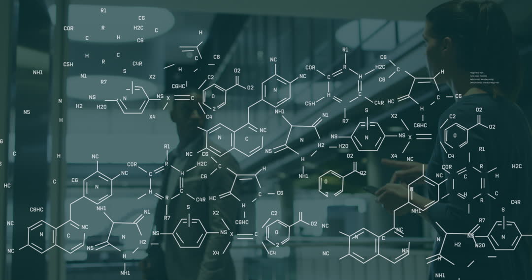 Scientists engage in discussion surrounded by complex molecular formulas on glass whiteboard. Captures essence of advanced research in chemistry and biotechnology fields. Ideal for use in educational materials, scientific articles, or promotional content for research labs.