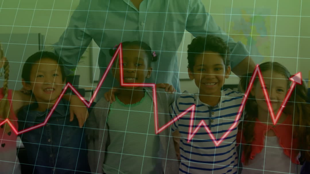 Diverse group of children with a teacher overlayed with a graph indicates a mix of educational diversity and business growth. Great for illustrating concepts of teamwork, educational trends, inclusive environments, or statistical analyses in education. Useful in reports linking education to progress or illustrating diverse team dynamics in schools.