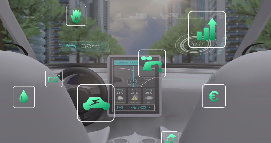 This futuristic scene shows a car interior with an advanced digital interface, highlighting green energy and eco-friendly concepts. Ideal for illustrating themes around the future of smart automotive technology, sustainable transportation, or data integration in vehicles, this video can be used in tech blogs, presentations on innovation in automotive design, and marketing for advanced vehicle systems.