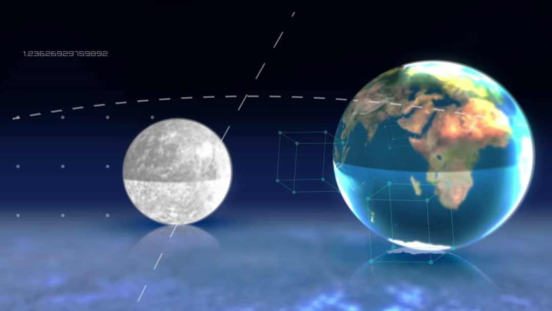 Visual depiction shows Earth, Moon, and graphic elements in space, illustrating technological aspects of celestial exploration, ideal for educational materials, science presentations, or digital media related to space science.