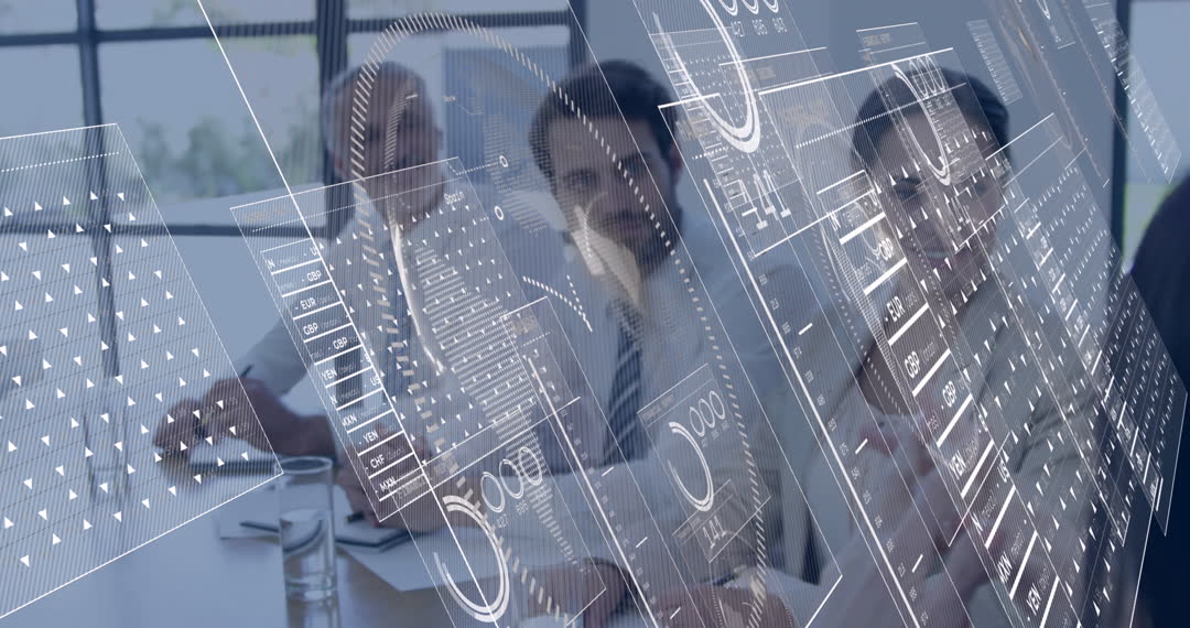 Business team engaged with digital data overlay showing concept of technological progress and information processing. Suitable for representing innovative office solutions, global business strategies, and technological advancements in professional environments.