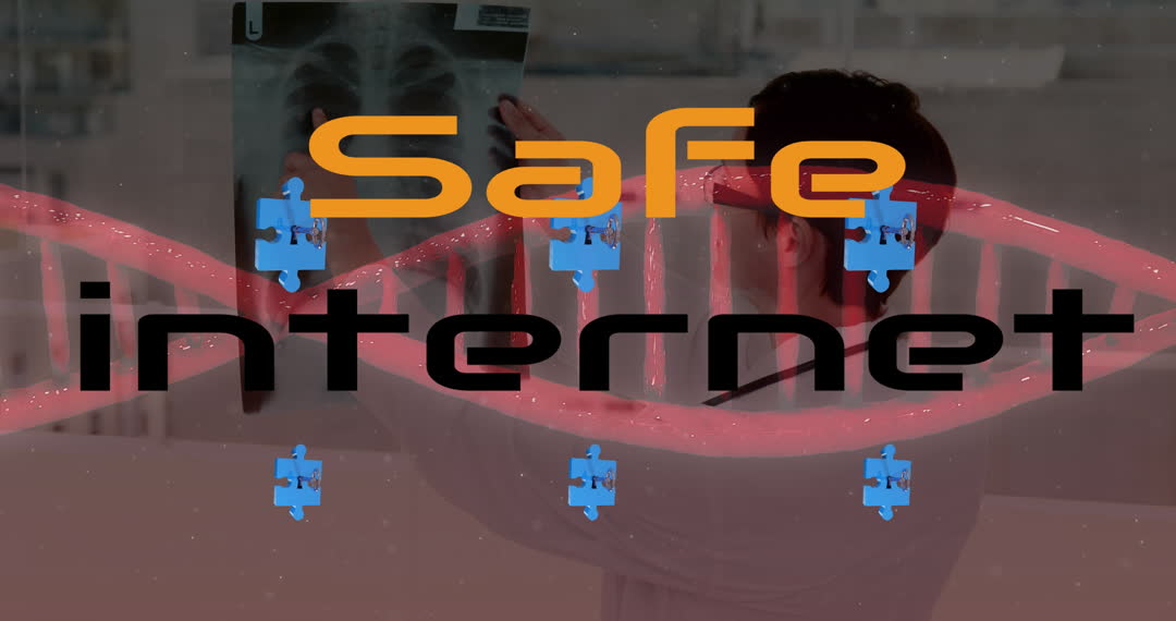 This animation creatively conveys the concept of secure internet usage. The combination of phrases like 'safe internet' and the puzzle motifs illustrate themes of cyber safety and piecing together security solutions. Suitable for use in presentations about data protection, digital safety campaigns, or security workshops, it captures attention with its vibrant visual metaphor. The inclusion of a scientist with an x-ray signifies a detailed and thorough approach to online safety measures.