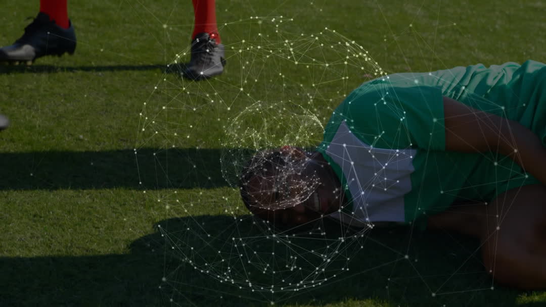Football player lying on field with digital connections overlay, representing global connectivity in sports. Ideal for use in tech and sports-related projects showcasing digital innovation and global outreach in athletics.