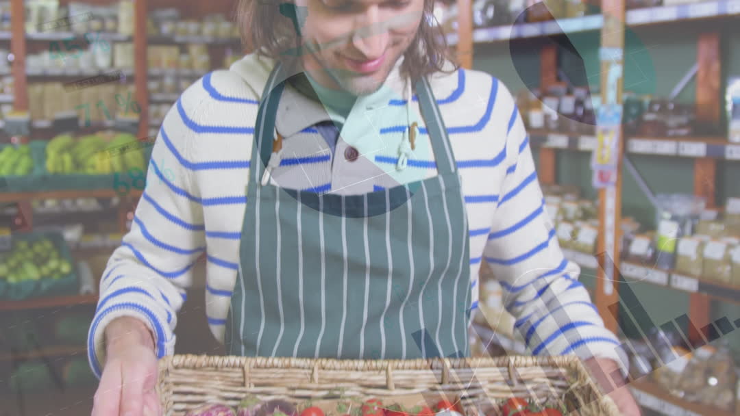 A male grocery store owner joyfully arranging fresh produce while financial graphs are layered over the scene, presenting a conceptual representation of economy influencing small businesses. Useful for content on economic reports, entrepreneurship, consultation for small business growth strategies, and financial literacy publications.