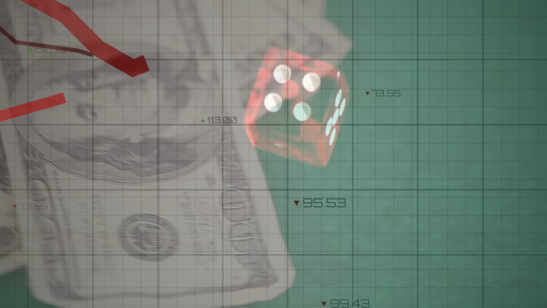 This video depicts the idea of financial risk and market volatility by showing dice placed over dollar bills, set against a backdrop of market data and graphs. Useful for illustrating topics related to economic uncertainty, investment decisions, casino games, market trends, or financial analysis in graphic design projects or educational materials.