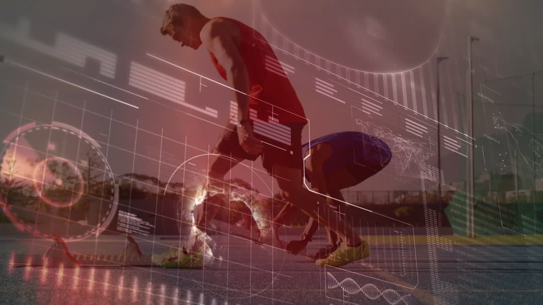 Concept shows athletes preparing for a sprint with digital data overlays symbolizing integration of fitness and technology. Perfect for illustrating sports innovation, use of smart tech in training, and futuristic athletic concepts. Can be used in articles or material related to digital transformation in sports.