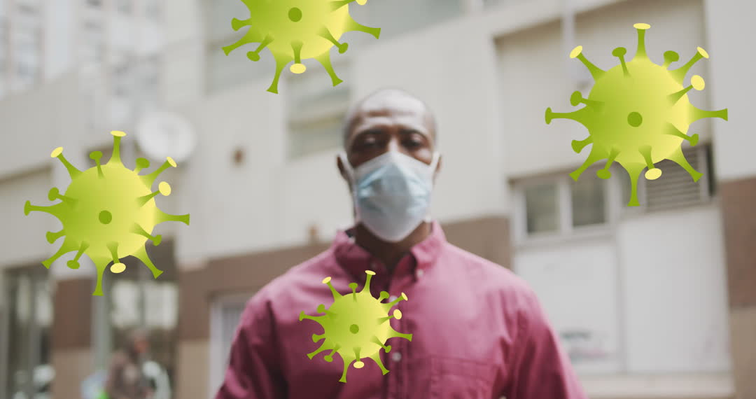 Man wearing face mask in urban environment with virus graphics conveys the tension of Covid-19 pandemic. Suitable for illustrating topics on virus spread, health precautions, urban pandemic challenges, and public health messaging. Can be used in healthcare materials, informative blog posts, or public safety ads.