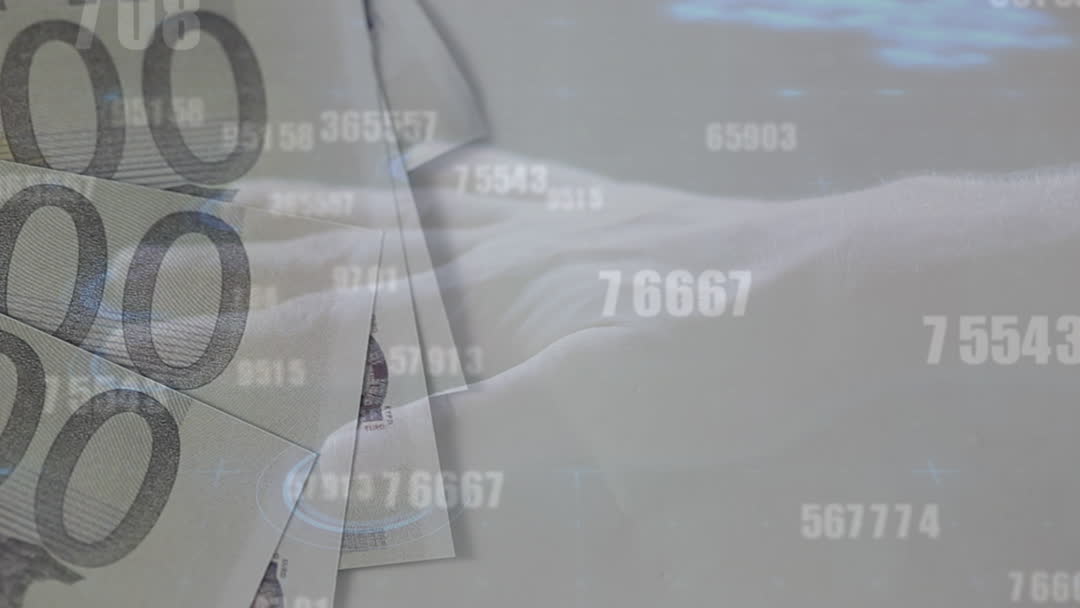 This conceptual video showcases an overlay of data processing elements along with euro banknotes and a human hand. It symbolizes themes of global business, financial analysis, and digital technology fusion, making it ideal for use in presentations that discuss financial technology, business strategies, or digital transformation.