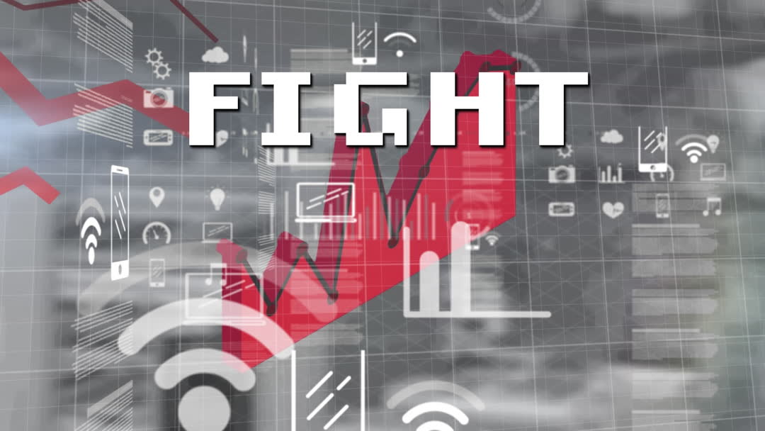 Digital graphic showcasing statistical indicators and bold 'FIGHT' text against a grey background with various conceptual icons. Suitable for illustrating themes of business growth, data analysis, technology strategy, and corporate competition.
