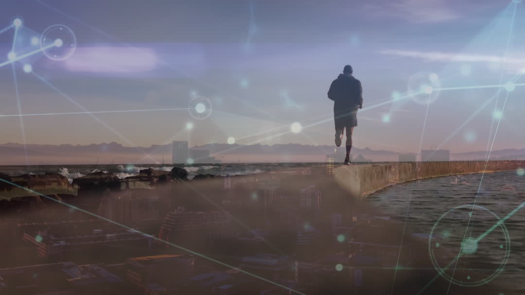 Conceptual Network Overlay on Runner Against Coastal Horizon Video