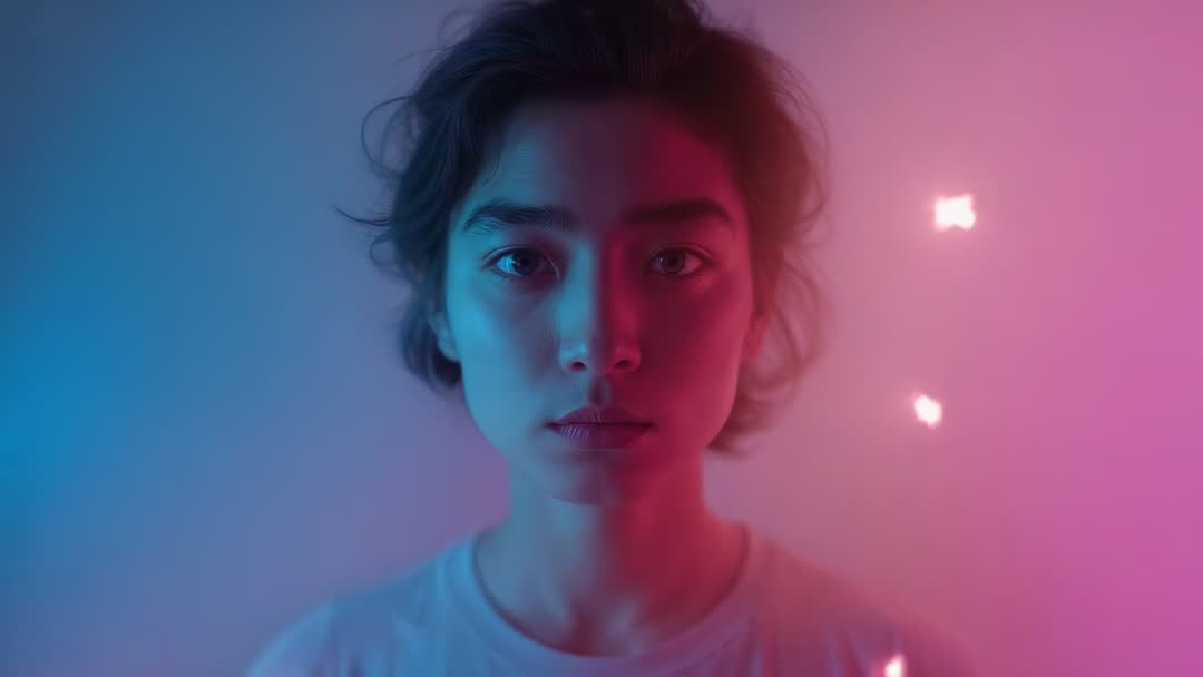 AI Generated Image. This atmospheric and moody video captures a woman in a studio, illuminated by ambient lights that cast a unique cyan and magenta gradient on her face, while sparks drift across the scene. The futuristic aura and artful lighting make it ideal for projects in media and creative industries, illustrating concepts of solitude, introspection, and modern aesthetics. Perfect for use in digital media artworks, fashion editorials, or abstract promotional materials focused on innovation and creativity.