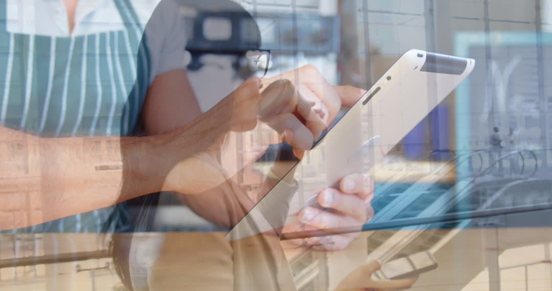 Illustration of hands using technology devices such as a laptop and smartphone, overlapping to symbolize technological integration in a business environment. Imagery represents modern workspace and data connectivity, ideal for use in articles about digital transformation, global connection solutions, or future trends in work technology.