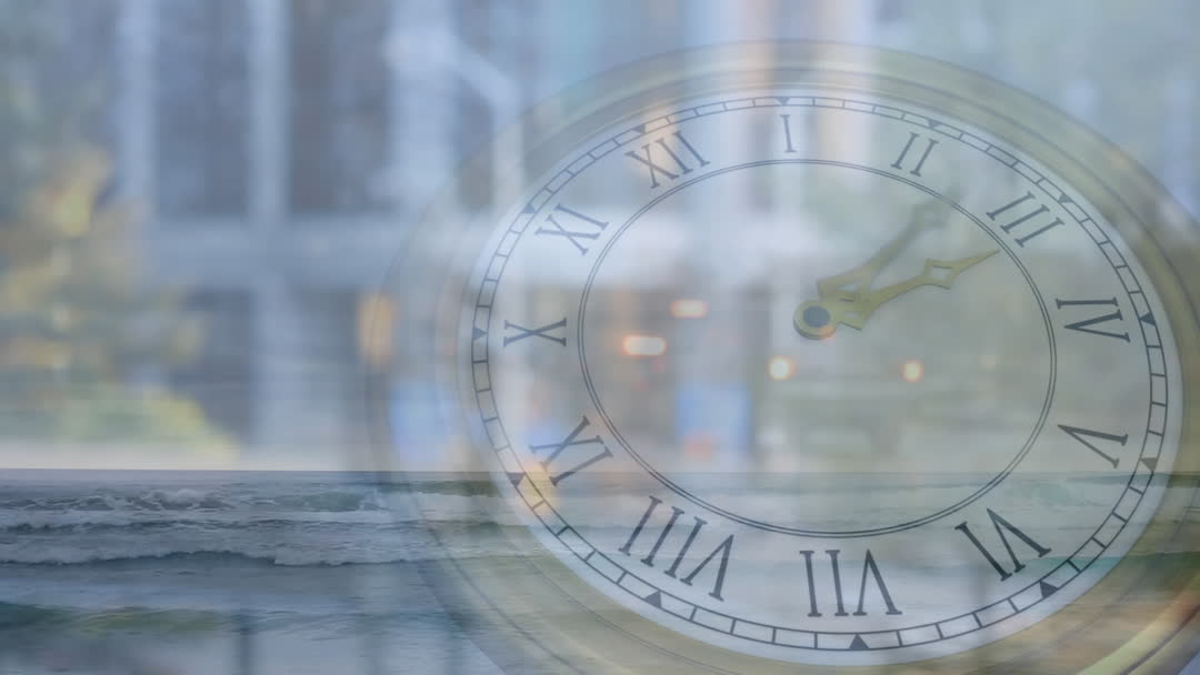 Motion graphic of clock embedded over idyllic scene, illustrating concept of time in a fluid, dreamlike manner. Use in projects focused on time management, global business themes, or conceptual discussions. Suitable for creative storytelling, presentations about time perception, or artistic projects aiming to depict passage of time visually.
