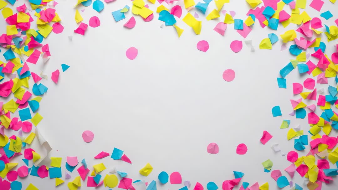 AI Generated Image. Featuring colorful paper confetti fragments falling and shifting along edges of white tabletop, forming wide central white space for text or graphics. Looping video clip showcasing gentle motion, suitable for social media stories, website headers, event promos, party invitations, and slideshow intros. Providing clean white center for headline placement, logo overlay, lower-third graphics, or product reveal. Working well with bold typography and bright color palettes, or as subtle festive accent behind product shots and announcement overlays. Delivering playful, celebratory mood for birthday, baby shower, graduation, seasonal promotion, and corporate celebration content. Offering easy cropping to vertical or horizontal formats and compatibility with slow-motion or speed-ramp edits. Perfect for designers and content creators needing loopable festive background with cheerful pink, cyan, yellow palette.