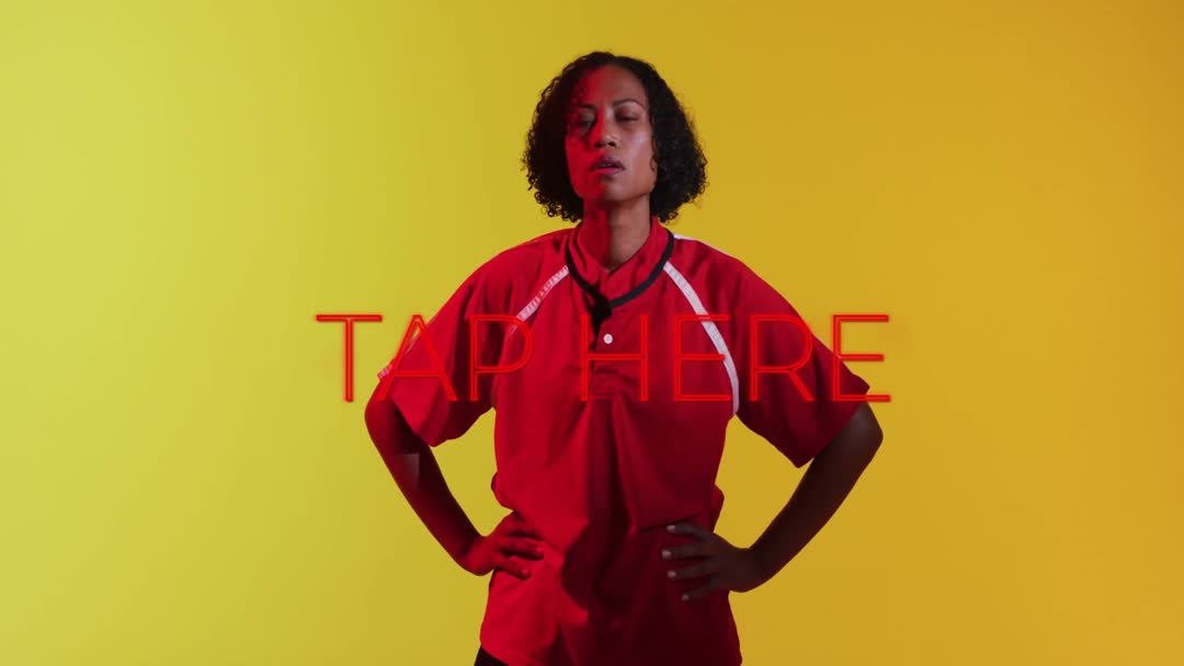 Person standing confidently in a red sports jersey against vibrant yellow background. Overlay text saying 'TAP HERE' adds dynamic and interactive element. Use this for sports marketing, empowering athletic visuals, or fitness-related motivational materials.