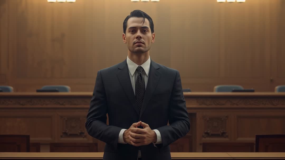 AI Generated Image. Footage showing male attorney in dark suit standing in courtroom preparing to address bench. Hands clasped and shoulders squared, conveying confidence and composure. Warm, cinematic lighting creating dramatic, focused mood while wood-paneled bench and empty counsel chairs remain softly out of focus. Camera framing centering subject in medium long shot, offering strong hero visual for editorial or promotional use. Usage ideas: law firm marketing videos, news segments covering high-profile trials, courtroom drama trailers, legal training and e-learning modules, documentary sequences about justice and legal process, corporate compliance presentations, editorial articles and blog headers, book covers and social media thumbnails. Working well for on-screen lower thirds, title cards, voiceover-driven sequences, quote overlays, and thumbnail art. Suggesting color grading with warm tones for authoritative feel or cooler tones for tense, investigative mood.