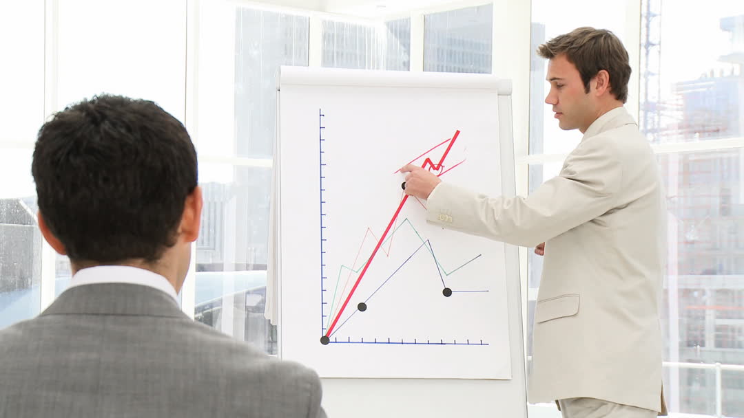 Business professional is leading a presentation in a modern office setting. He is pointing to growth chart on flip chart, suggesting analysis of financial or company statistics. Colleague attentively following the discussion supports themes of teamwork, business communication, and corporate strategy. Useful for visuals related to business meetings, growth strategies, and professional teamwork visuals.