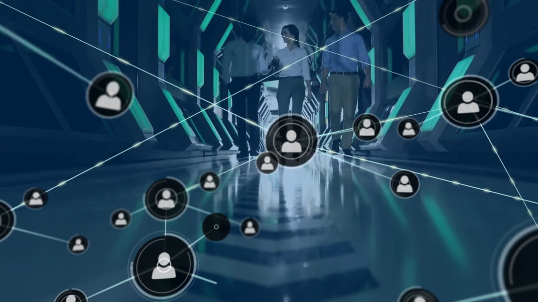 Business professionals walking confidently in a server room with digital icons representing global connections. The videory of virtual networks highlighting themes of teamwork and technology makes it ideal for depicting modern business environments, presentations on connectivity, or innovative corporate culture.