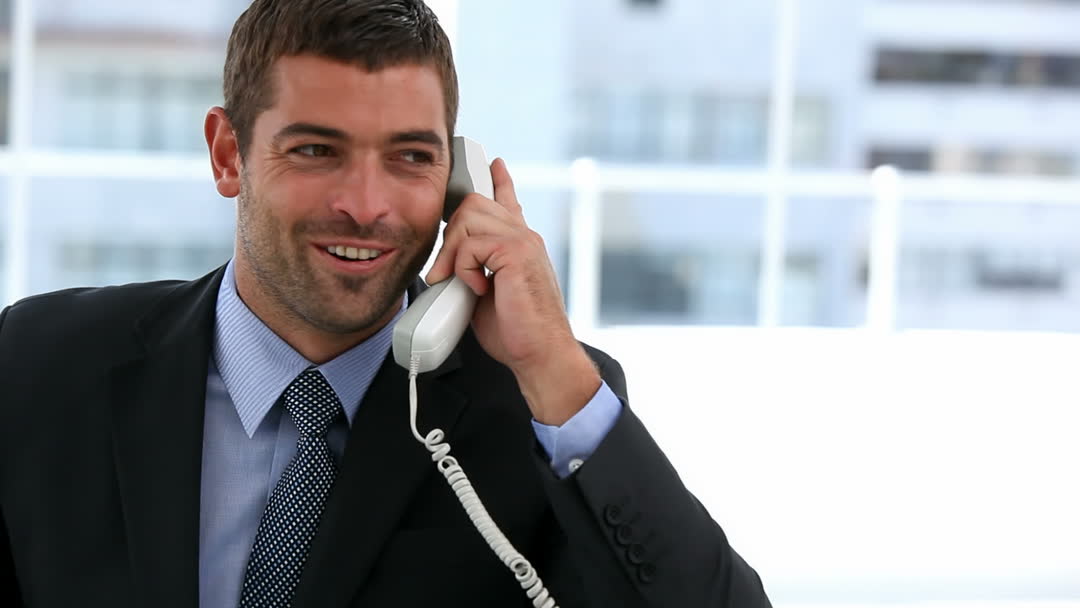 A businessman in a suit is using a landline phone in a modern office. His confident expression suggests that the conversation is important and positive. This video is ideal for representing successful business communication, corporate professionalism, and customer service. It can be used on business websites, brochures, or articles related to corporate world, customer relations, and person-to-person communication.