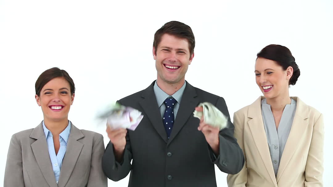 Man holding and moving banknotes joyfully while two colleagues stand beside him smiling. Represents financial achievement, teamwork, and prosperity in a professional environment. Ideal for websites or articles focused on finance, corporate success, motivation, or advertising banking services.