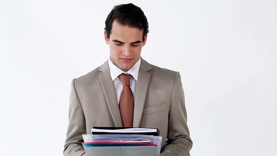 Young businessman in a beige suit holding a stack of files, examining documents with a focused expression contrasting against white background. Ideal for business-themed materials, corporate presentations, or articles about business strategies and professional settings.